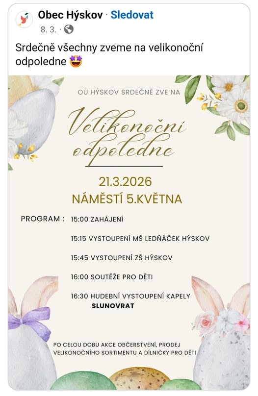 Moc náš těší pozvání obce Hýskova a to, že naše kapela Slunovrat Vám v sobotu 21.3. může zpříjemnit společné velikonoční odpoledne